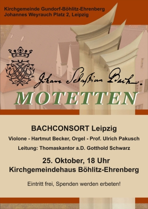 Herzlich eingeladen sind Sie zum Konzert am 25. Oktober, um 18 Uhr, in den Kirchgemeindesaal BöhlitzEhrenberg. Es werden Motetten von J.S. Bach und G.Ph. Telemann erklingen.